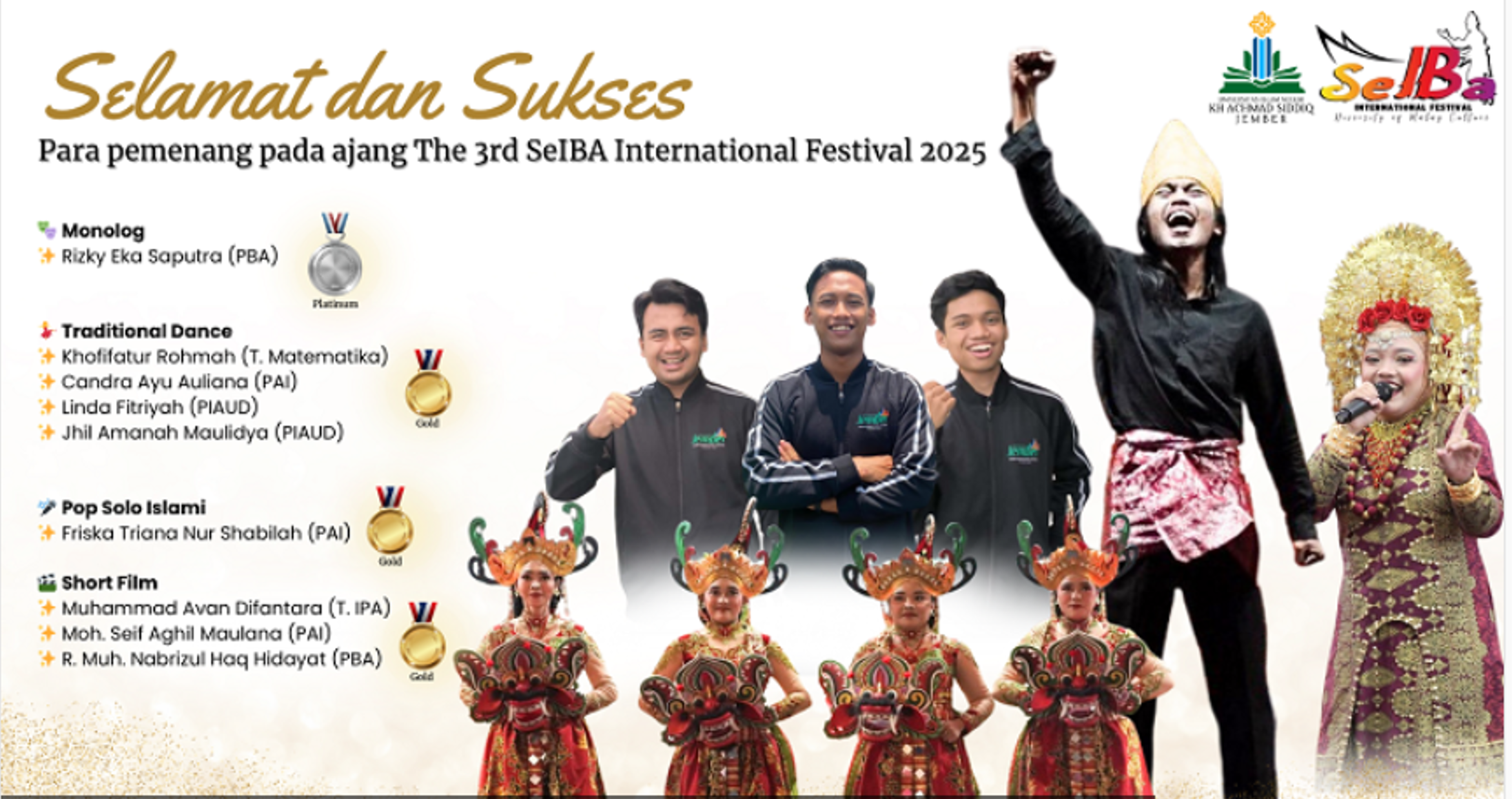 Para penerima medali terdiri dari mahasiswa dari berbagai jurusan: Pendidikan Bahasa Arab, Tadris Matematika, Pendidikan Agama Islam, Pendidikan Islam Anak Usia Dini, serta Pendidikan IPA. Mereka berhasil meraih medali emas dalam kategori seperti Drama Monolog, Tarian Tradisional, Pop Solo, dan Short Film. Di antara nama-nama yang disebut adalah Rizky Eka Saputra (Drama Monolog, Bahasa Arab), Khofifatur Rohmah (Tadris Matematika), dan Friska Triana Nur Shabilah (Pop Solo). Nama lain termasuk Candra Ayu Auliana, Linda Fitriyah, Jhil Amanah Maulidya, Muhammad Avan Difantara, Moh. Seif Aghil Maulana, dan R. Muh. Nabrizul Haq Hidayat turut berjaya dalam kategori masing-masing. Masing-masing mahasiswa menunjukkan konsistensi kualitas karya dan ekspresi unggul di panggung internasional. Pencapaian ini menegaskan bahwa kompetensi lintas disiplin menjadi aspek penting dalam pembelajaran di kampus.