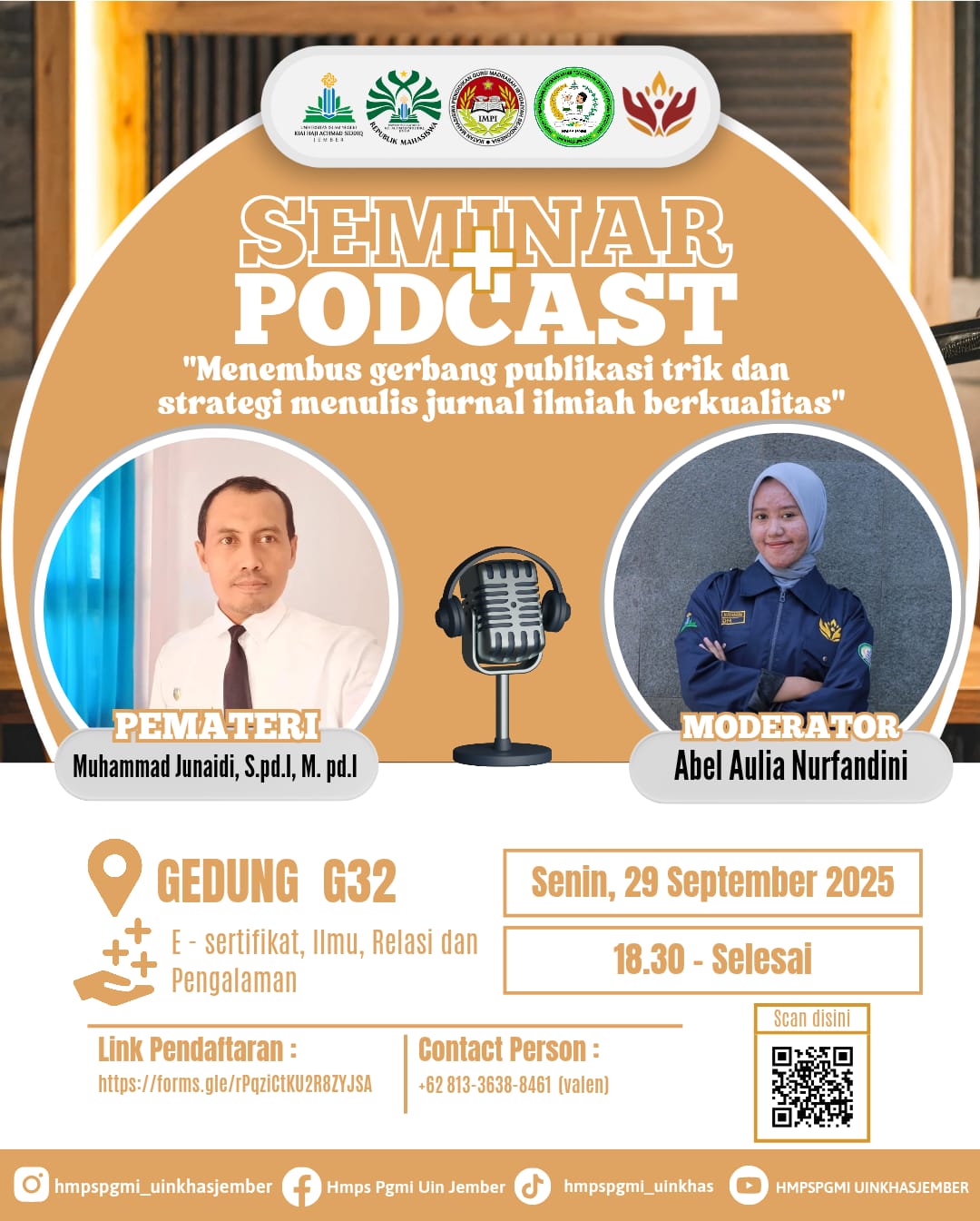 Jember (29/10/2025) – Himpunan Mahasiswa Program Studi (HMPS) Pendidikan Guru Madrasah Ibtidaiyah (PGMI) periode 2025/2026 Fakultas Tarbiyah dan Ilmu Keguruan (FTIK) UIN Kiai Haji Achmad Siddiq sukses menyelenggarakan acara seminar dan podcast bertajuk "Menembus Gerbang Publikasi: Trik dan Strategi Menulis Jurnal Ilmiah Berkualitas" pada Senin, 29 September 2025, pukul 18.30 WIB bertempat di Gedung G32.